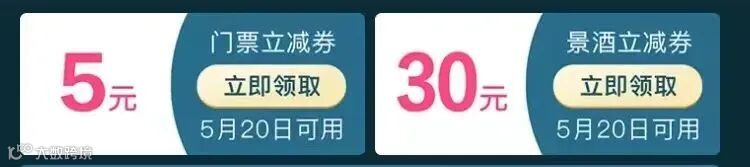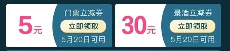 老规矩,5月20日活动当天,先领券再下单,更优惠~这次可用的券有两类,适用于门票和景点+酒店套餐,仅限5月20日当天活动产品可用: