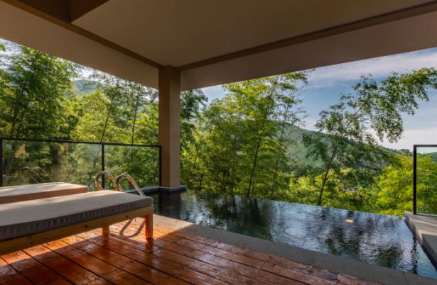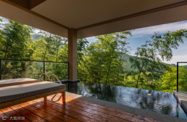 整体承袭了“隐于竹海,伴以温泉”之静逸和大隐于野之清幽,纵情山水间,心游尘世外。每栋都拥有开阔的溪谷竹景,观着竹海泡御水温泉,仿佛在云端一样!另外配套1栋接待楼、1栋餐厅、1栋活动中心。酒店内有接驳车,接送客人出行。