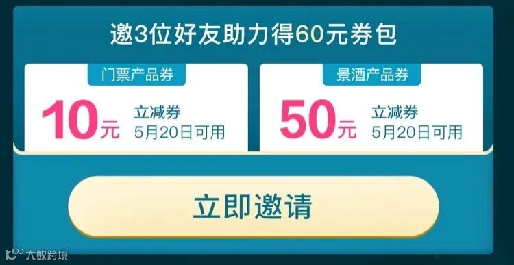 2.邀请3人助力即可获得更大优惠:门票10元无门槛立减券,景点+酒店套餐50元无门槛立减券。动动手指就能搞定。