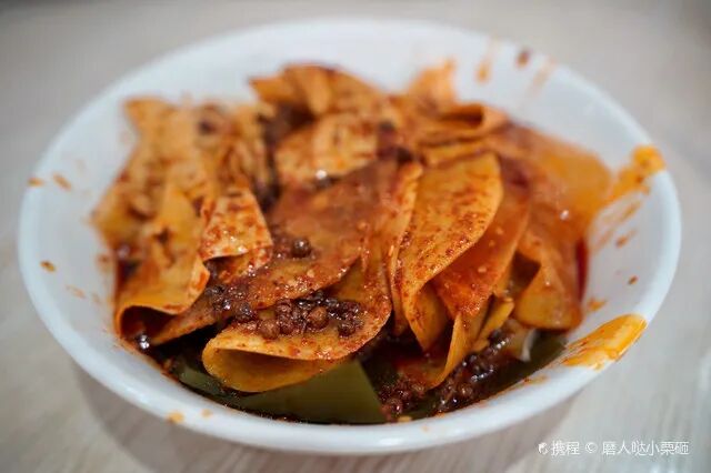 洋芋片也是这里的一大畅销小吃,土豆切得透光般薄,只需在调制好的汤中轻轻一煮即可出锅,浇上辣油就算完成了,咬起来口感爽脆。