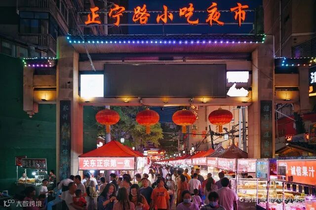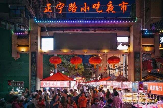 黄昏后的正宁路小吃夜市,人头攒动,叫卖声此起彼伏,美食的香味复去又回。看着一大把羊肉串在炭火上翻飞,人间烟火气扑面而来,心情也瞬间被治愈。