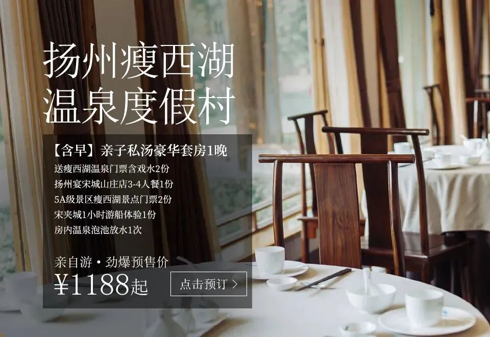 套餐3:1188元起,亲子私汤豪华套房1晚+扬州宴宋城山庄店3-4人餐1份+宋夹城1小时游船体验1份