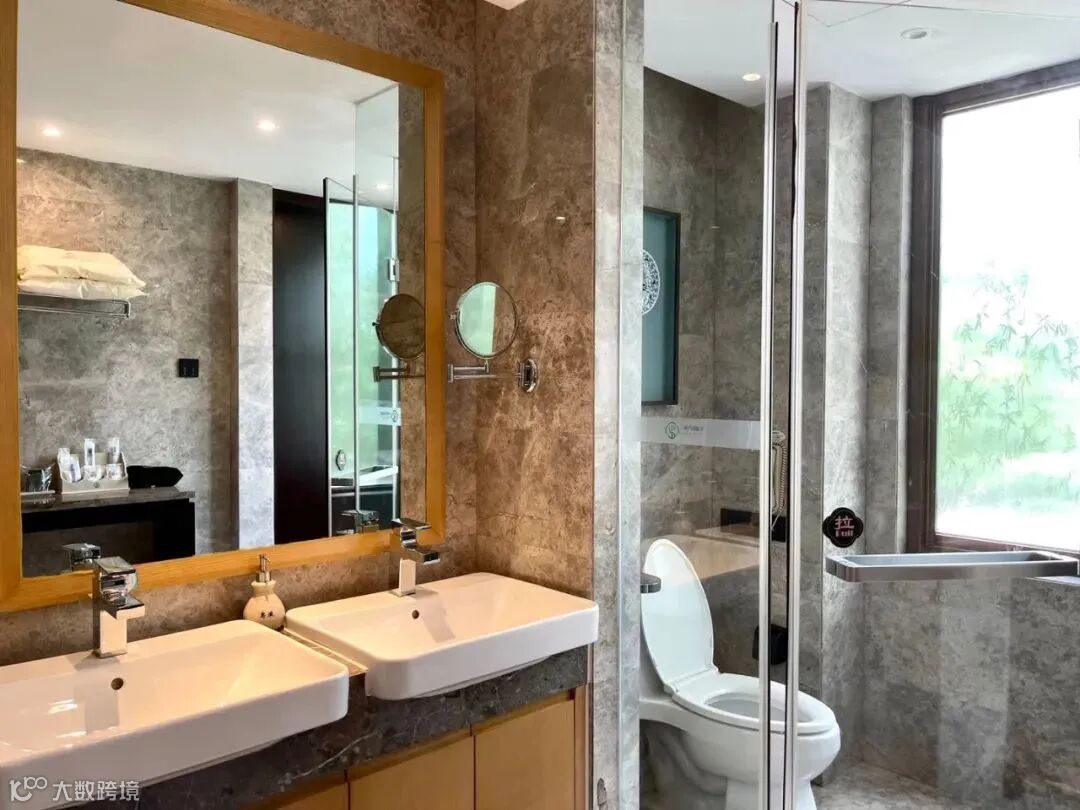 卫生间标配双洗手台设计,少见的是像杯子、浴巾、洗澡拖鞋等都是消毒过再塑封包装的,显得更干净更省心了。