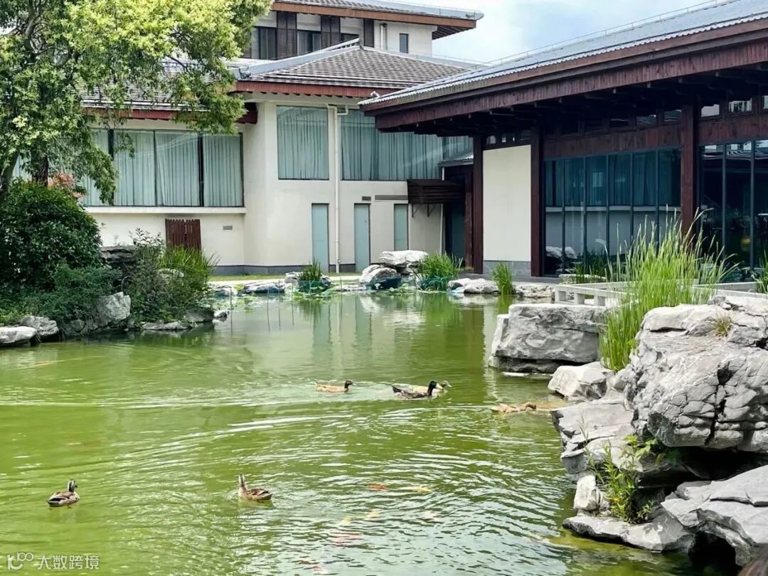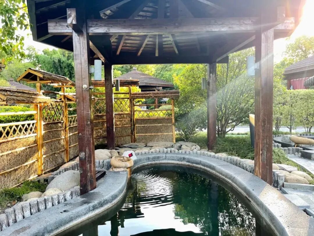 树上飞着蓝喜鹊,池塘里游过成群的鸭子和锦鲤,室外温泉区甚至还有溪水小瀑布的造景,野趣十足。