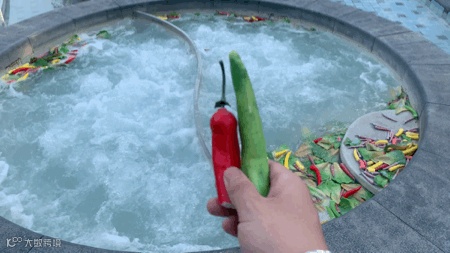 撒上辣椒白菜道具的鸳鸯锅,一按按钮水居然还会“沸腾”,哈哈哈,泡在里面感觉自己都成了火锅食材煮了。