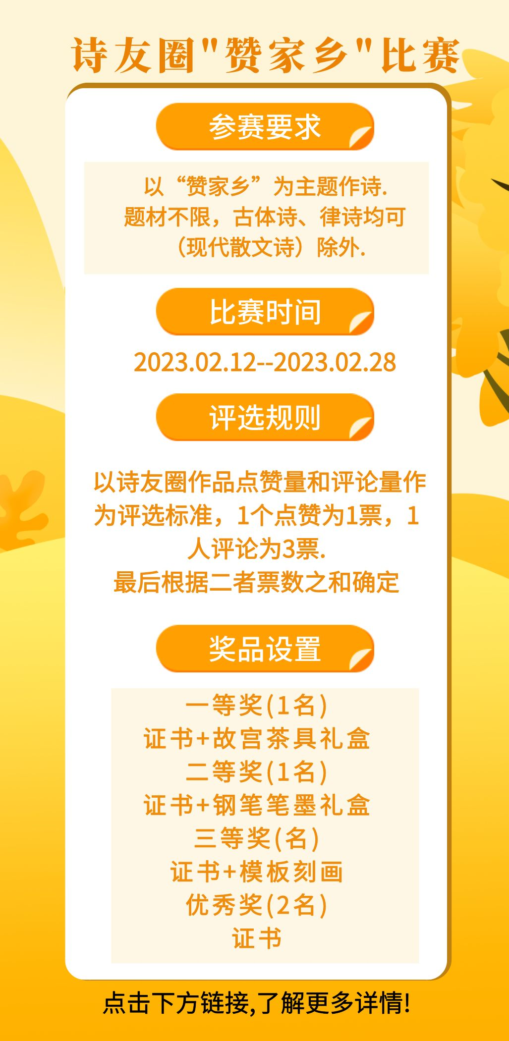 更多详情请点击链接查看:重要通知丨诗词天地 诗友圈“赞家乡”诗词比赛开始啦!