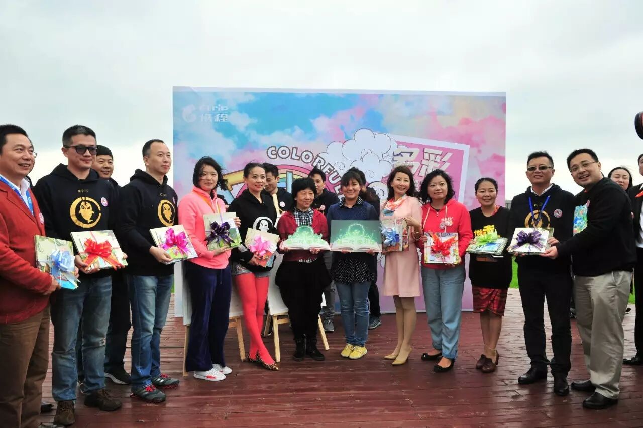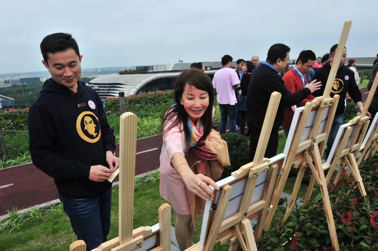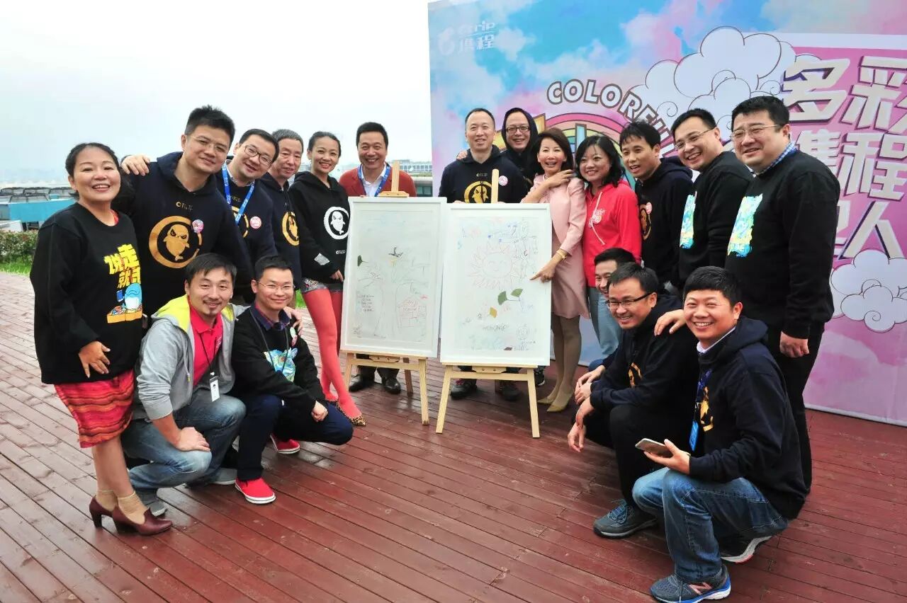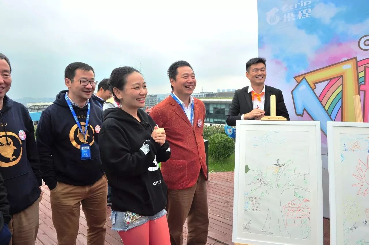 高管们欣然挥毫做画,描绘17岁少年携程的别样姿彩。现场还举行了“程二代”图书馆的捐赠仪式。