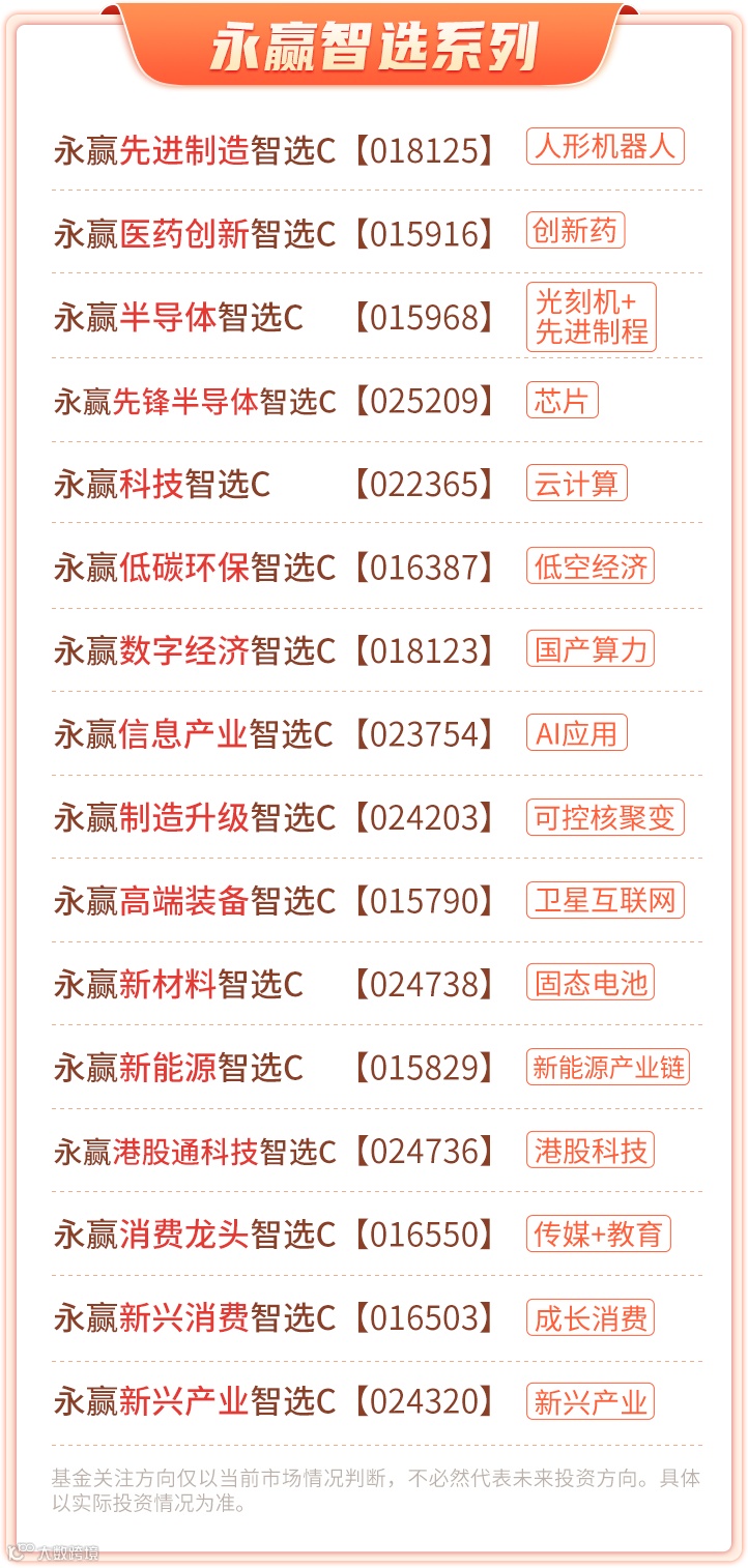 风险提示:投资有风险,投资须谨慎。基金管理人承诺以诚实信用、勤勉尽责的原则管理和运用基金资产,但不保证本基金一定盈利,也不保证最低收益。本基金的过往业绩及其净值高低并不预示其未来业绩表现,基金管理人管理的其他基金的业绩并不构成对本基金业绩表现的保证。投资不同类型的基金将获得不同的收益预期,并承担不同程度的风险。通常基金的收益预期越高,风险越大。以上基金均属于中等风险(R3)产品,适合经客户风险承受能力等级测评后结果为平衡型(C3)及以上的投资者。基金风险等级与投资者风险承受能力等级对照表详见永赢基金官网。投资者通过代销机构提交交易申请时,应以代销机构的风险评级规则为准。以上基金可投资于港股通标的股票,除了需要承担与境内证券投资基金类似的市场波动风险等一般投资风险之外,还面临汇率风险等境外证券市场投资所面临的特别投资风险。敬请投资者在做出投资决策之前,仔细阅读产品法律文件,充分认识本基金的风险收益特征和产品特性,充分考虑自身的风险承受能力,理性判断并谨慎做出投资决策。