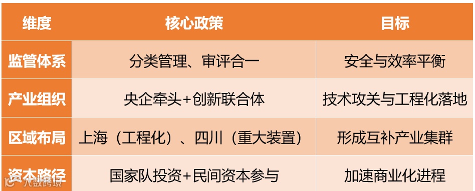 中国在可控核聚变领域的政策布局已形成多层级、多维度体系,涵盖监管框架、产业推进、地方协同及资本支持等方面,旨在加速技术攻关与商业化进程。