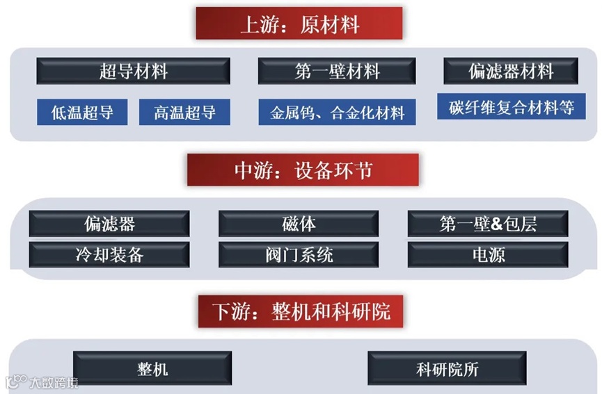 从产业链来看,可控核聚变产业链主要分为上游原材料、中游设备、下游整机三大环节。