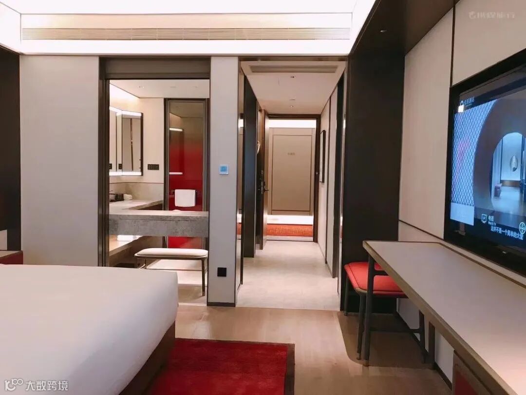 酒店整体设计为新中式风格,大理石纹和中国红相得益彰,穿过11米的观景长廊,才会进入酒店大堂,意境非常妙。27楼还有一间黑胶唱片吧,文艺范拉满了,非常值得打卡。房间古典雅致,还有非常好闻的木质调香薰味,住进去了就想赖着不走。