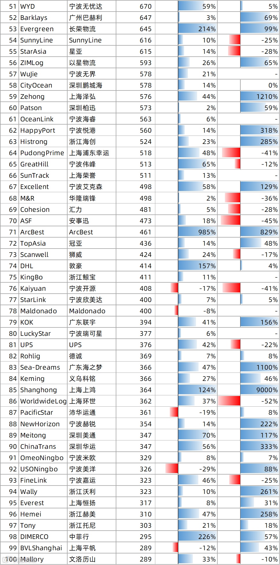 宁波本地货代表现活跃:宁波顺圆稳居前三,宁波环美、欣皓等保持中上游;宁波欧然从第30位波动上升至第4位。部分上海货代(如德威、千亚)也稳定在中上游