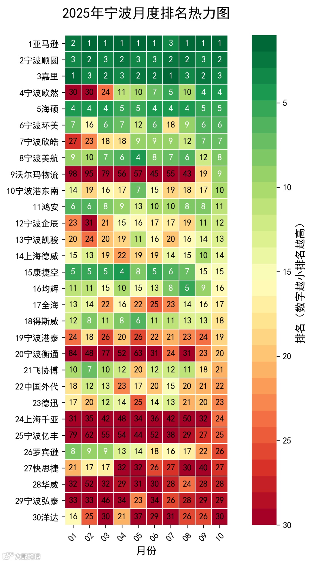部分公司排名显著上升:沃尔玛物流从第98位跃升至第9位,升幅最大;宁波衡通从第84位升至第20位,但月际波动明显