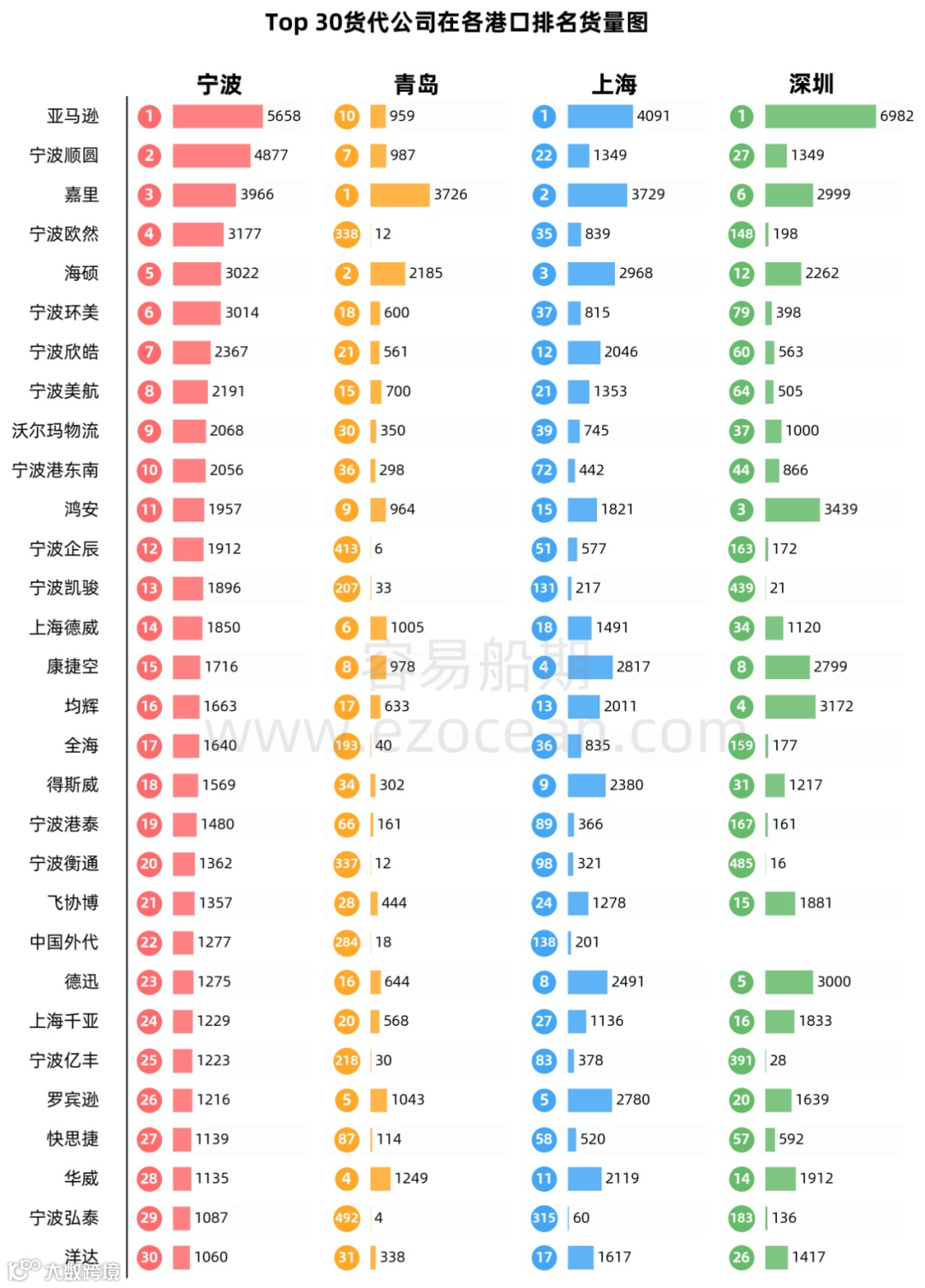 前 10 名阵营中本土企业占 6 席,前 30 名中本土货代数量达 12 家。无论是货量规模,还是增长速度,均充分彰显了 “宁波本地货本土货代主导” 的市场格局。