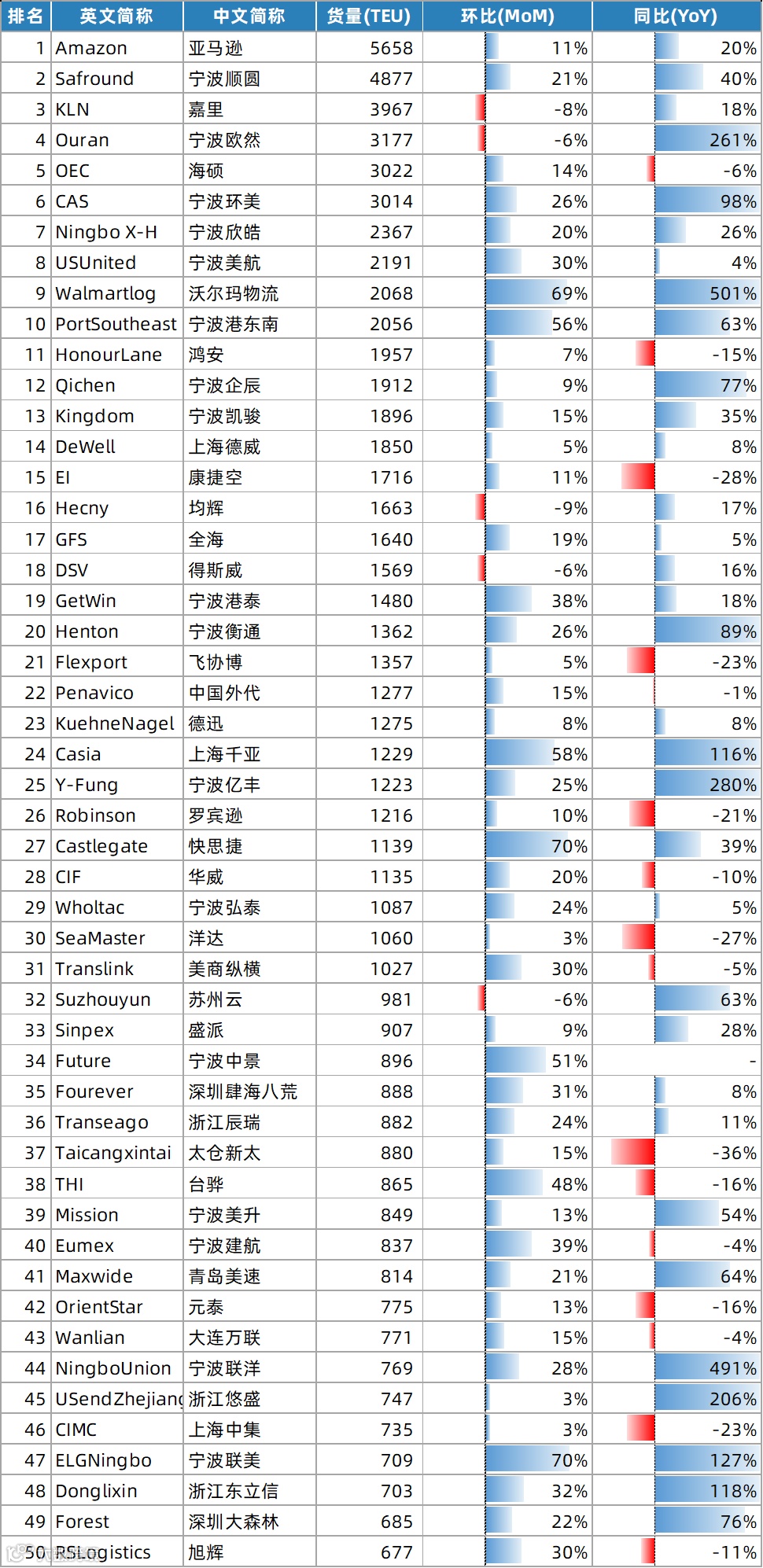 领先公司地位稳固:以亚马逊、宁波顺圆、嘉里(KLN)为代表的前三名,月度排名在1-3位间小幅波动,地位稳固
