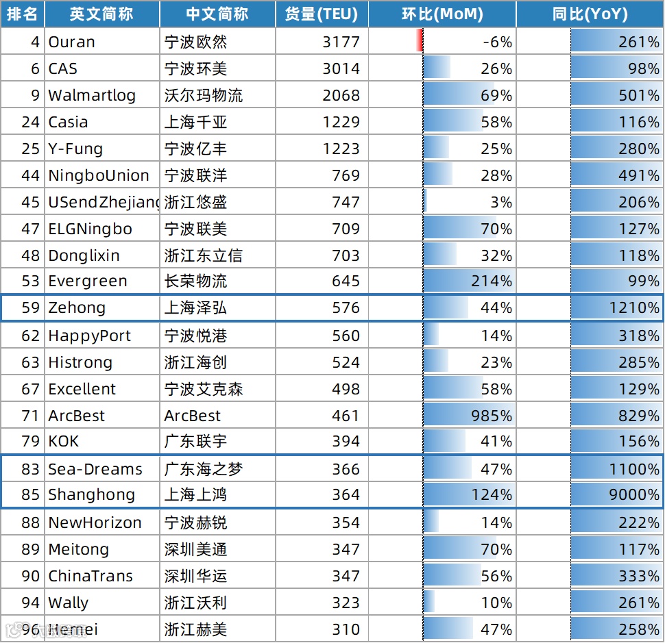 与2024年10月相比,货量同比增长超过90%的公司有23家,超过半数来自华东,其中浙江13家,上海3家。值得关注的是:沃尔玛物流、ArcBest两家欧美公司及宁波联洋均实现约五倍的强劲增长;而上海上鸿、上海泽弘与广东海之梦三家的增速则高达十倍以上,增长表现尤为惊人,但这三家公司的货量规模较小。