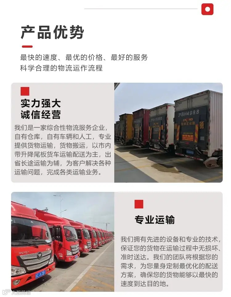 - 整车运输:适合大批量货物,车型包括4.2米、6.8米、9.6米、13米及17.5米挂车,载重覆盖1.5吨至35吨。