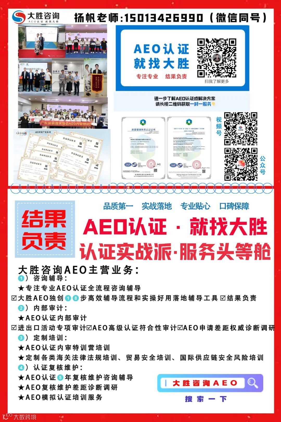 大胜咨询主营业务领域:专注专业AEO认证全流程咨询辅导、AEO认证复审重认维护全流程辅导、常年AEO认证维护服务、进出口活动专项审计、AEO高级认证符合性审计、定制各类海关法律法规培训、贸易安全培训、国际供应链安全风险培训、AEO认证内审特训营培训、AEO模拟认证培训服务、现场调研诊断服务、涉外领域贸易合规咨询筹划等。