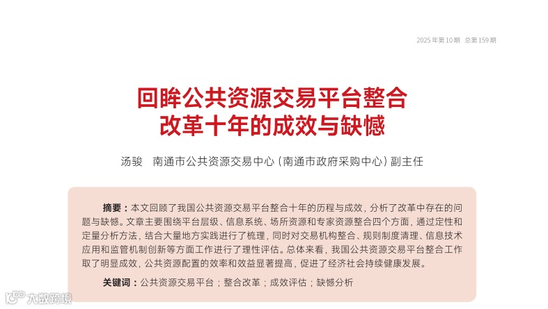 [2]杨浩.公共资源跨区域跨层级跨平台交易问题研究[J].招标采购管理, 2024,(11):29-31.