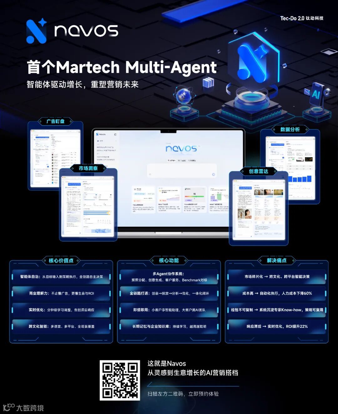 钛动科技将带来自研全球首个Martech Multi-Agent (全球营销多智能体平台)Navos——通过人工智能(AI)+大数据(BI)与多Agent协作,为出海企业提供从市场洞察分析、广告创意内容生成到广告预算投放优化的全链路智能营销服务。