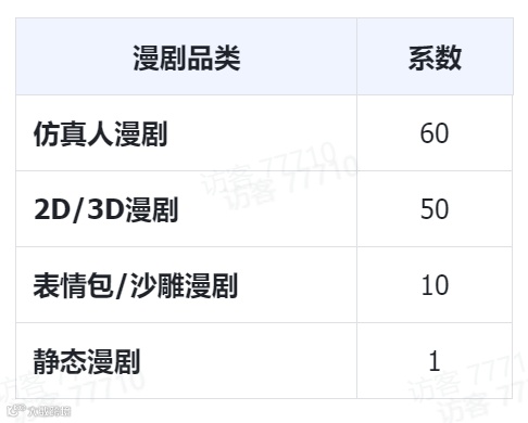其中,不同漫剧品类对应不同的系数。此次调整后,仿真人漫剧对应的系数为60,2D/3D漫剧系数为50,表情包/沙雕漫剧系数为10,静态漫剧系数为1。