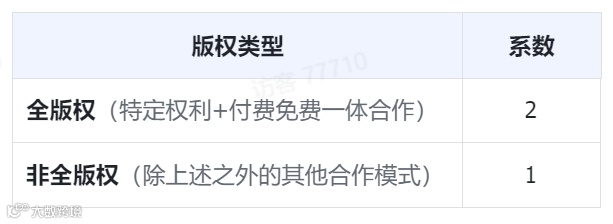 同时,版权系数按照全版权和非全版权区分,全版权对应的系数为2,非全版权系数为1。