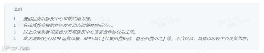 尽管公告强调,本次调整仅涉及APP运营场景,包括【红果免费短剧、番茄免费小说】等,不含抖音,具体以版权中心决策为准,且后续分成系数会根据业务发展动态调整并提前公示。