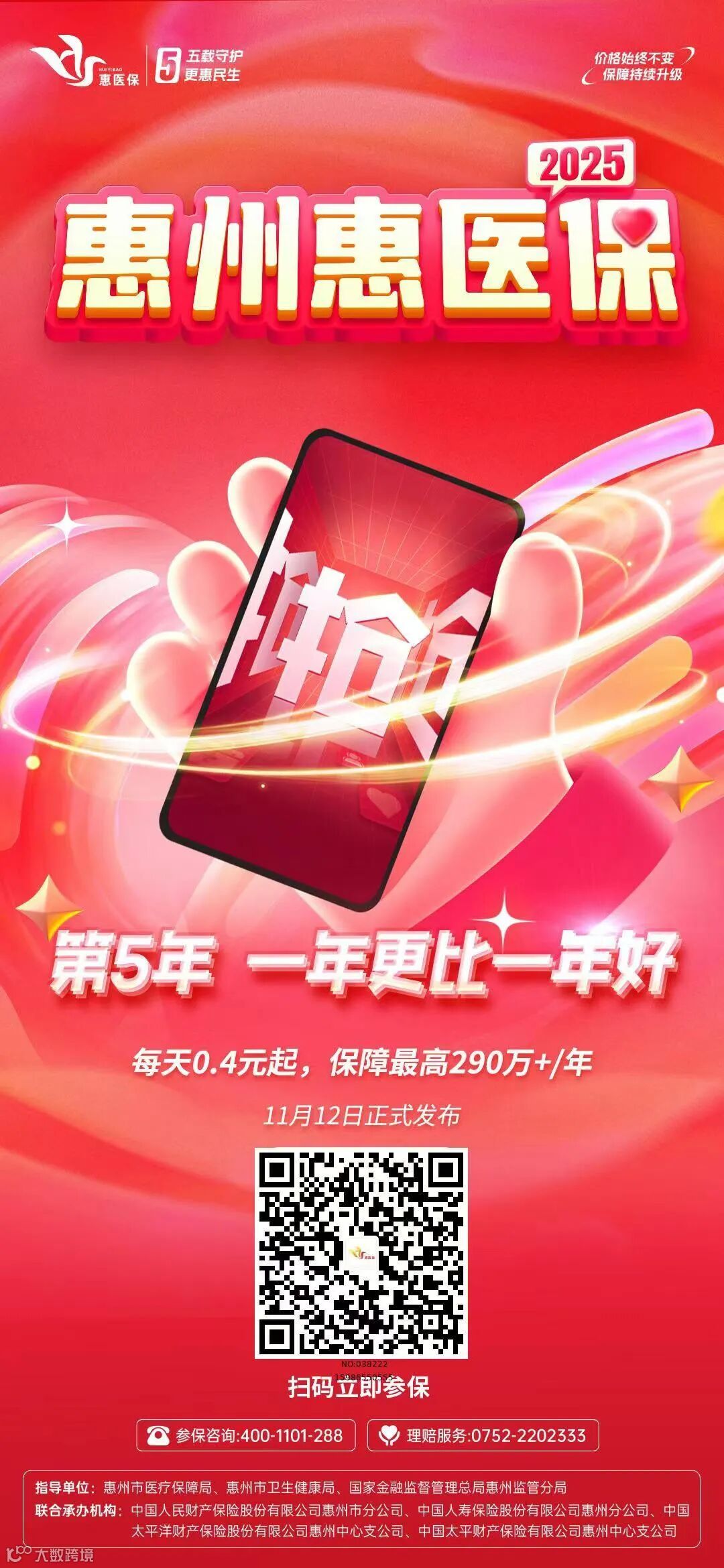 2025年“惠医保”集中参保时间为2024年11月12日至2024年12月31日,保障时间为2025年1月1日至2025年12月31日。保费标准不变,60周岁以下人群缴费150元/人/年、60周岁及以上人群缴费200元/人/年,即可获得最高一年超290万元的保障。职工医保参保人员可使用本人的个人账户,为自己及近亲属参保缴费,也可选择微信、支付宝、云闪付等方式缴费,更多详情可致电400-1101-288或0752-2202333。倡议全市基本医保参保人积极参保“惠医保”,为自己、为家庭构筑起更牢固的健康防护墙。