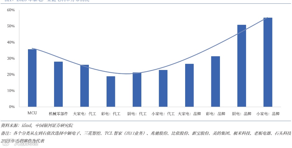 除王洋提到的问题外,制造业利润低、代工厂性质强,被锁死在价值链的相对低端。2023年大家电、彩电、厨电、小家电企业品牌厂商销售毛利率分别为26.5%、31.3%、50.7%、55.1%。同期代工厂对应的毛利率分别为25.9%、18.8%、21.2%、22.7%,品牌厂商明显享受到溢价空间。