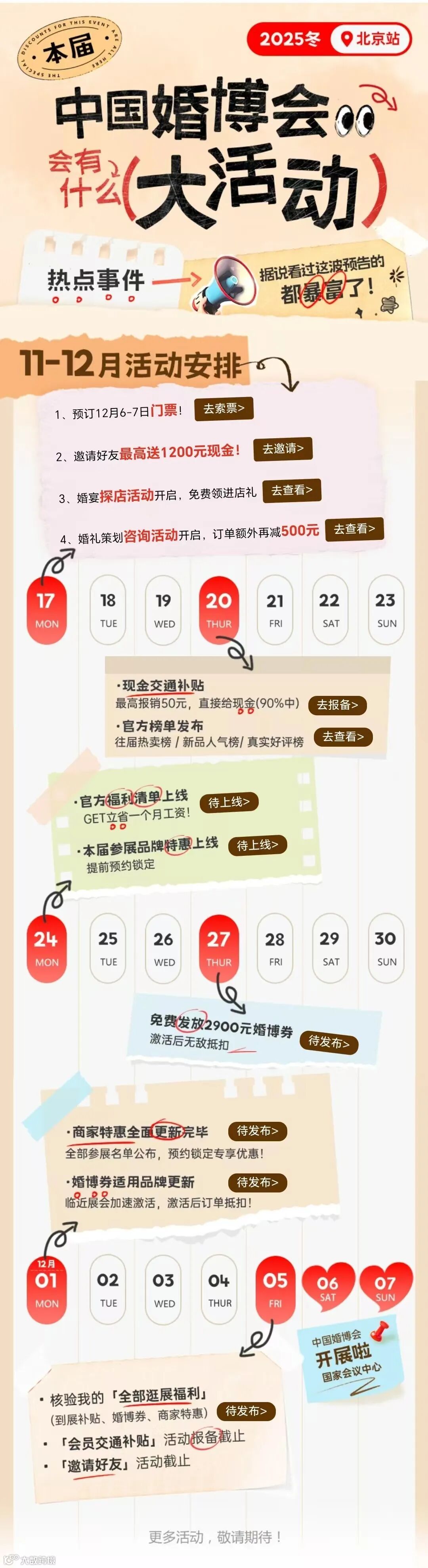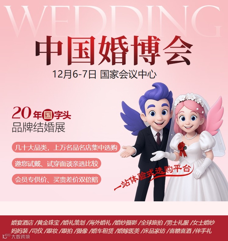2025冬季北京婚博会将于12月6-7日在北京国家会议中心(北京市朝阳区天辰东路7号)举办。拍婚照、订婚宴、找婚庆、买婚纱、选钻戒,还有喜酒喜糖、婚车、床品,20大结婚行业品牌参展,2天逛展一站购齐,省去东奔西跑,关键价格还优于门店,为您的婚礼精打细算!