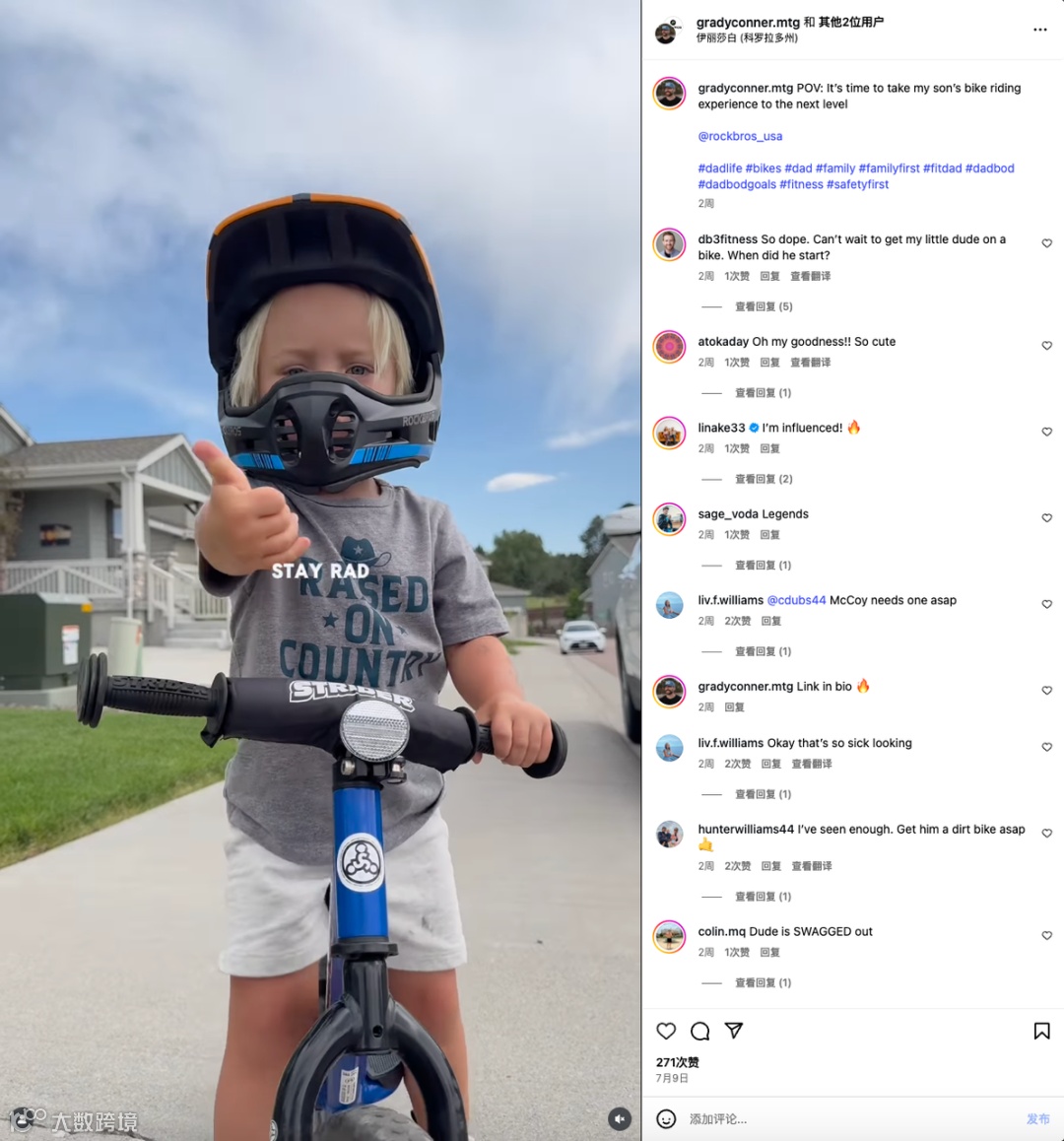 庞大的数量意味着内容形式的多样化,在这些KOL中既有年轻的女性用户拍摄穿戴RockBros骑行服的过程展示风采;也有男性用户分享自己的日常骑行时最常用到的RockBros配件;甚至还有家庭博主为自己的儿子购买RockBros头盔来保障安全。