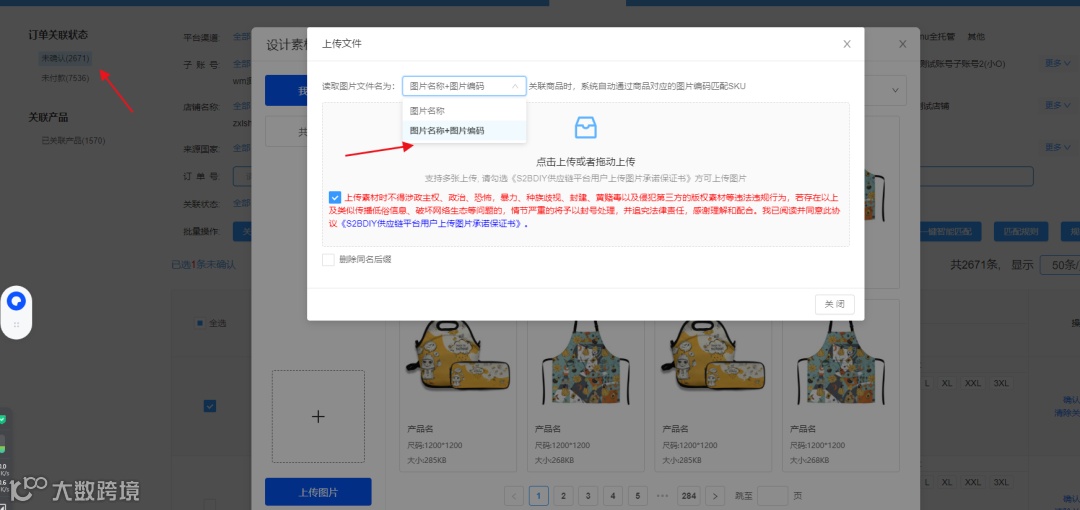 - 上传设计图时,选择“图片名称+图片编码”读取文件名。