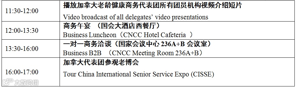 在中国社会福利和养老服务协会的大力支持下,加拿大驻华大使馆将于2019年8月23日老博会期间主办“中加养老合作论坛”。此次论坛全天日程包括主旨发言、视频推介和商务会谈。论坛主旨发言部分将聚焦加拿大在养老服务和职业教育领域的创新和经验。届时加拿大专家们将就养老服务如何应对老年人口需求的变化、加拿大养老模式如何落地中国、如何开展老年人居家康复、加拿大老年照护职业教育体制和优势等进行介绍。论坛的日程草案、演讲嘉宾和摘要、及代表团企业介绍附后。论坛报告部分将提供同声传译。敬请您拨冗莅临!