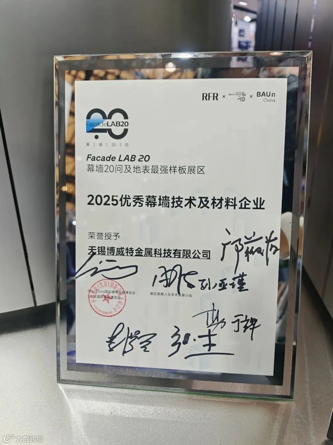 在本次大会上博威特金属科技有限公司凭借其创新的不锈钢产品,荣获"2025优秀幕墙技术及材料企业"荣誉称号。公司受邀参与l"Facade Lab 20幕墙20问"技术研讨时,展示了超长横向无拼缝不锈钢包柱解决方案,引起了行业的广泛关注。