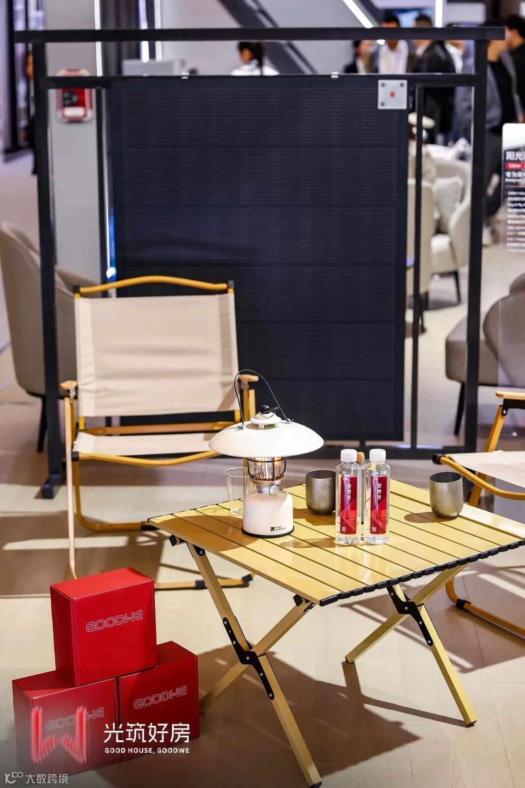 在展区设计上,固德威将“科技感”与“体验感”相融合,打造沉浸式零碳空间。旭日系列展区搭建了喷淋防水装置,直观展示旭日瓦出色的防水性能,吸引了众多客户驻足体验;天玑系列展区将光伏组件巧妙融入啤酒吧台,以建筑光伏一体化的设计理念,让绿色科技与休闲社交完美融合;阳台光伏展区则以露营氛围为主题,营造轻松自在的交流场景,吸引大量客户与设计师前来洽谈,成为全场焦点。