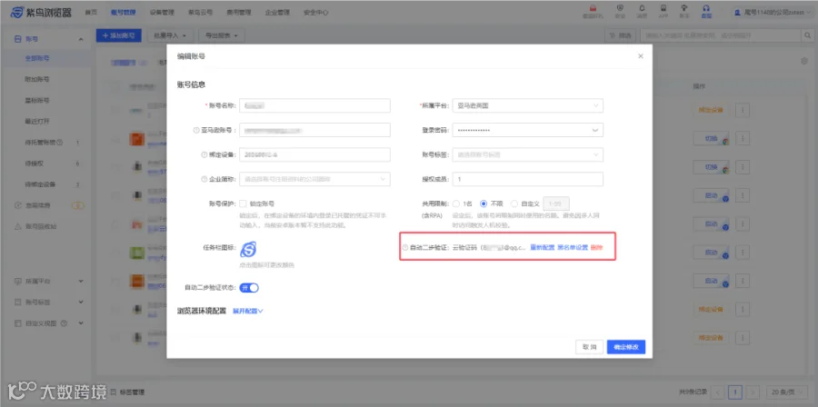 第五步:在紫鸟浏览器中编辑账号弹窗中,查看是否已配置密钥。已配置密钥则是开启成功,我们只需要验证一下是否正确获得一次性验证码即可。