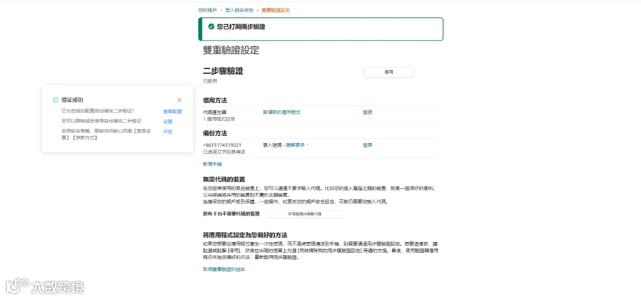 第七步:待页面自动跳转到下图所示的”二步验证设置页“即完成配置。