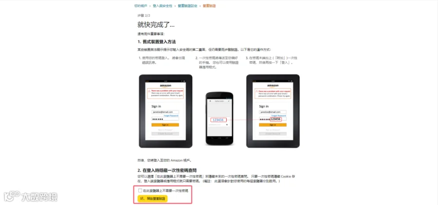 第六步:跳转至此页面时,浏览器已将当前账号配置相关密钥。亚马逊也开启了二步验证。你需要点击【好、开启二步验证】确认是否在当前浏览器需要二步验证即可