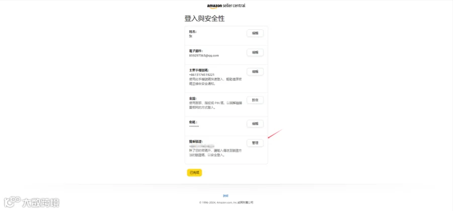 第一步:👉 操作路径:登录亚马逊店铺-点击右上角【设置】-点击【登录设置】- 管理【两步验证设置】,点击【管理】二步验证。
