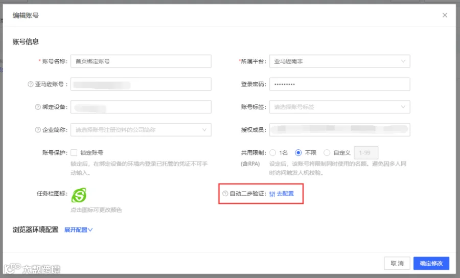 当自动二步验证区域显示【去配置】,说明还该账号还未开启“自动二步验证”,可登录店铺后台查看平台账号的二步验证功能配置,根据亚马逊后台的配置情况开启“自动二步验证”。