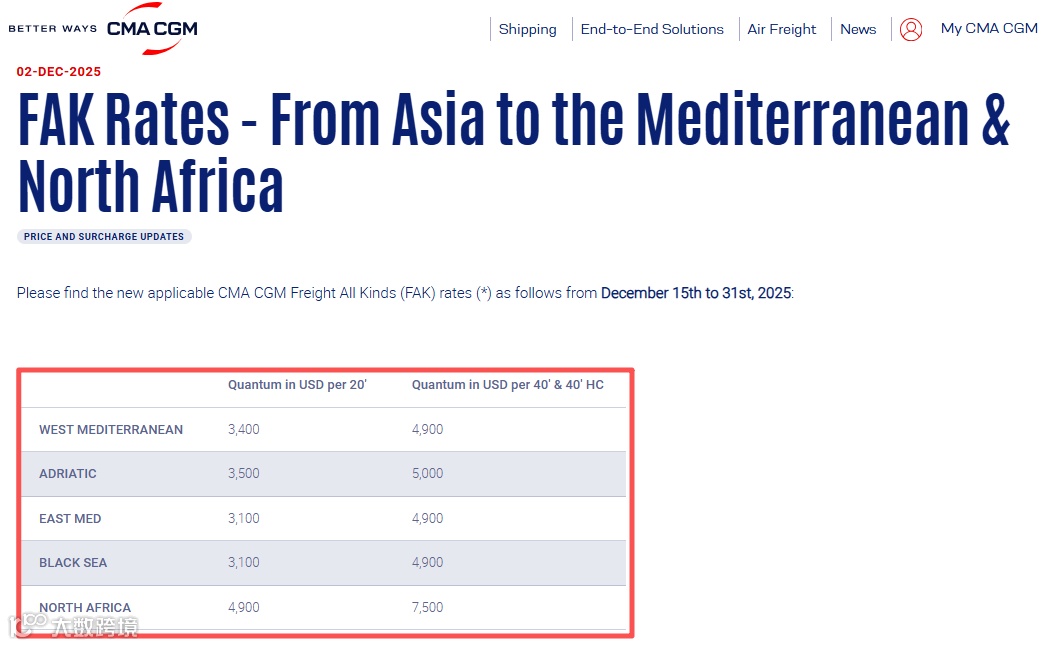 继MSC宣布自2025年12月15日起上调北欧、地中海(包括西地中海、东地中海、亚得里亚海和北非)以及黑海港口的运价后,12月3日,达飞发布公告,宣布也上调北欧、地中海和北非FAK费率,最高7500美元/FEU。
