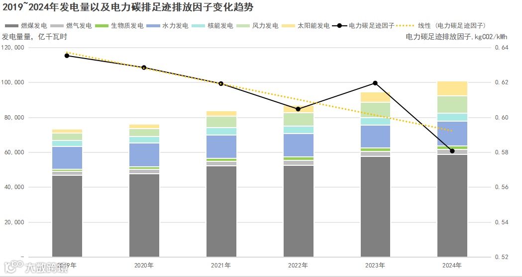 从用电角度来看,过去6年间,社会总用电量快速增长,从2019年的7.3万亿千瓦时增长到2024年的9.9万亿千瓦时,复合增长率超过6.2%,2024年总发电量更是超过10万亿千瓦时。并且随着电力替代工作推进,发电量与用电量增长的趋势在短时间内不会改变,因此,推测全国电力碳足迹因子核算公式中的"分母"将在一定时间内持续扩大。