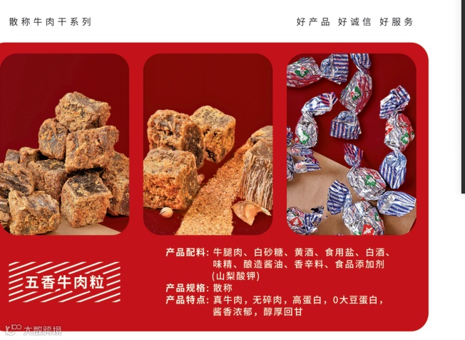 五香牛肉干·香辣牛肉干·五香牛肉粒·沙嗲牛肉粒·手撕五香牛肉·手撕麻辣牛肉·麻辣牛肉黑片·油麻五香牛肉·油麻香辣牛肉·五香卤牛肉·红烧牛筋腩