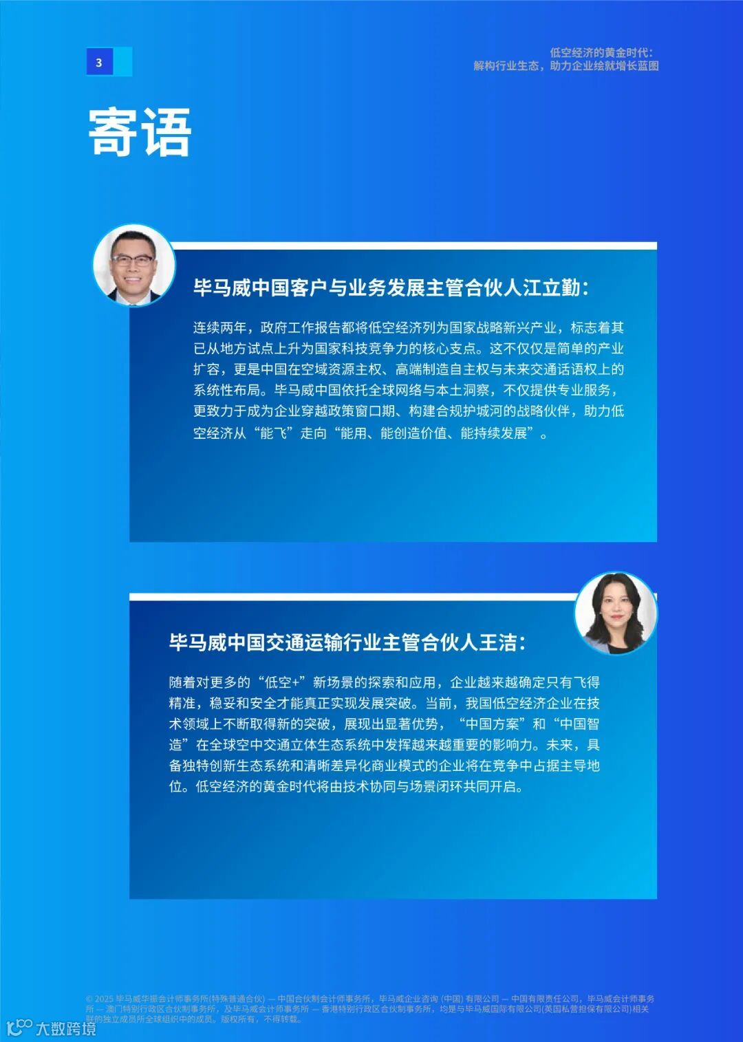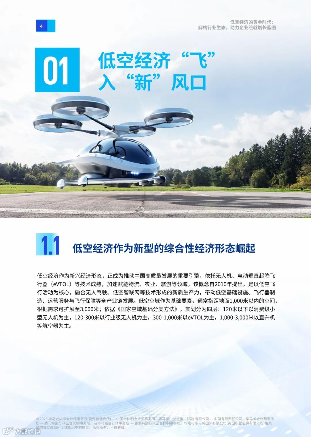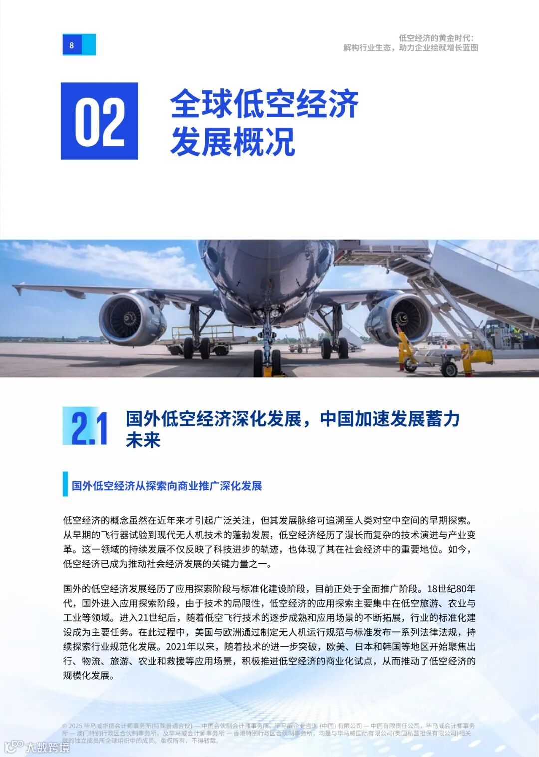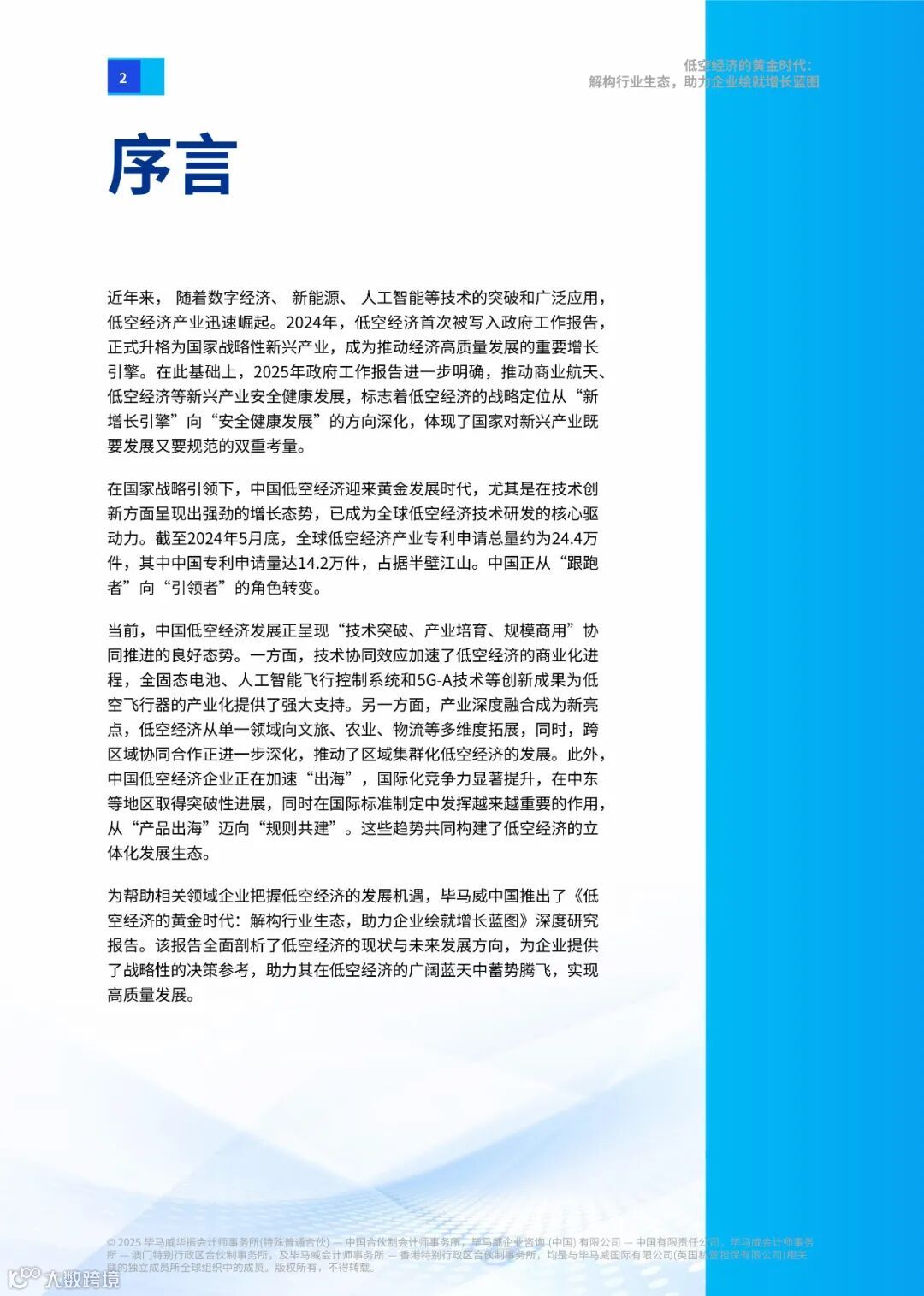 2025年被视为低空经济的“基建年”与规模化落地的“关键年”,中国低空经济正迎来前所未有的发展机遇。为助力相关企业把握战略先机,毕马威中国发布《低空经济的黄金时代:解构行业生态,助力企业绘就增长蓝图》研究报告,深入剖析行业发展现状与未来趋势,为企业高质量发展提供决策支持。