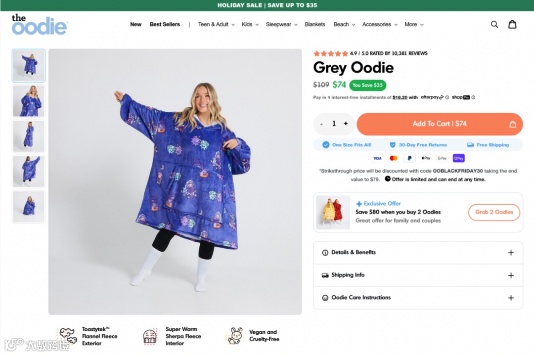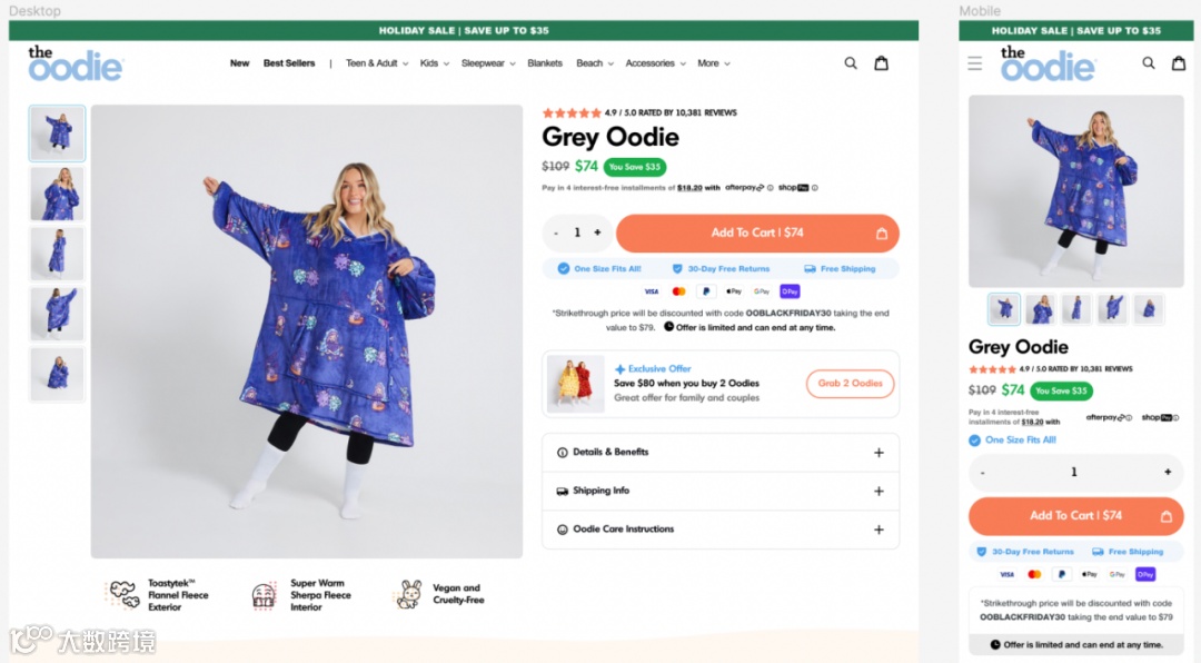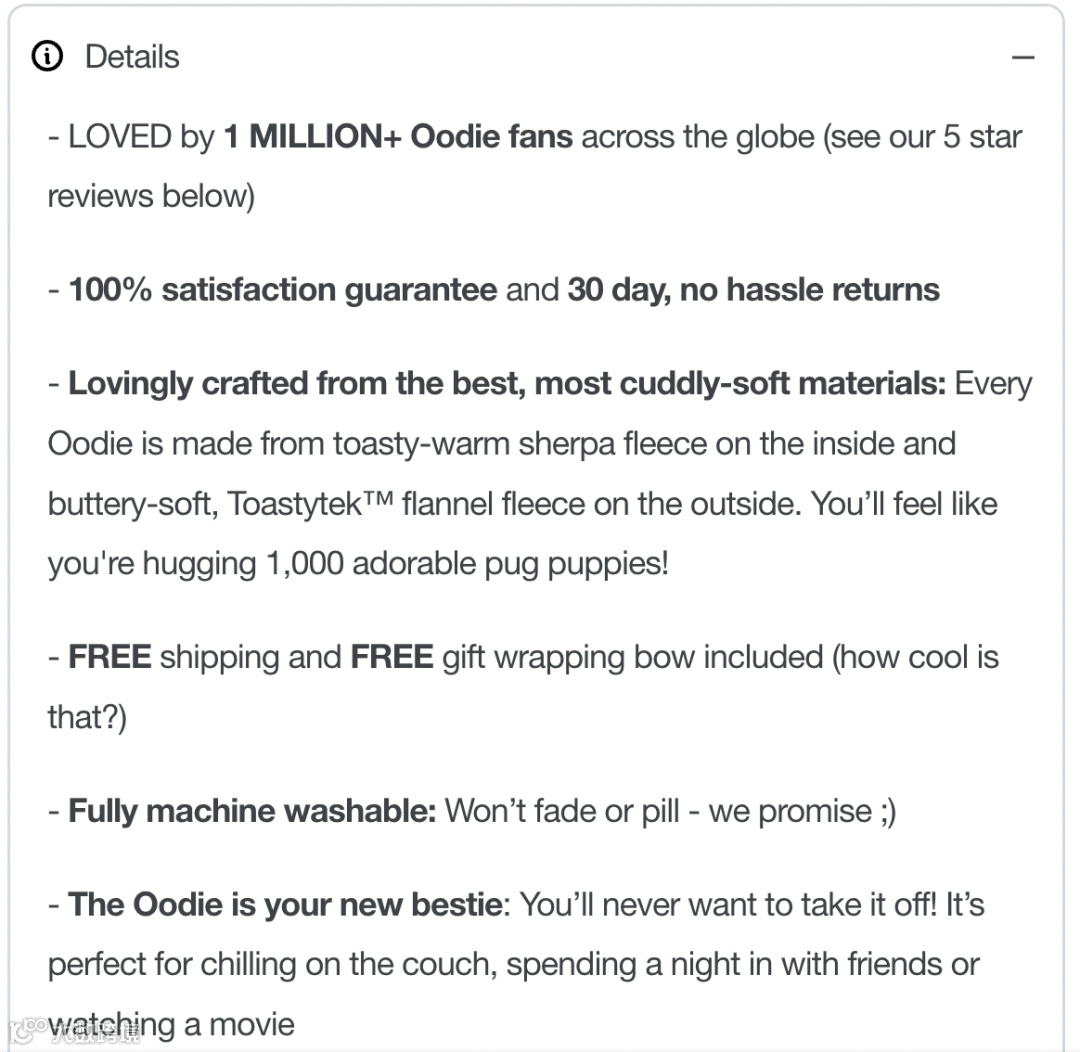 在此,介绍了制作 Oodie 的材料,并使其独一无二。可以使用类比或讲故事的方式,唤起潜在客户的感觉或情感。