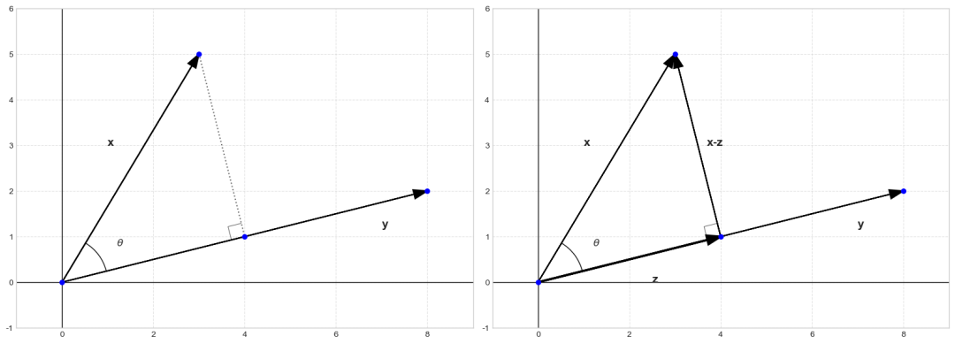 在上图中,我们将向量 正交投影到向量 的方向上,得到了一个新的向量 (图右)。