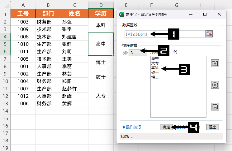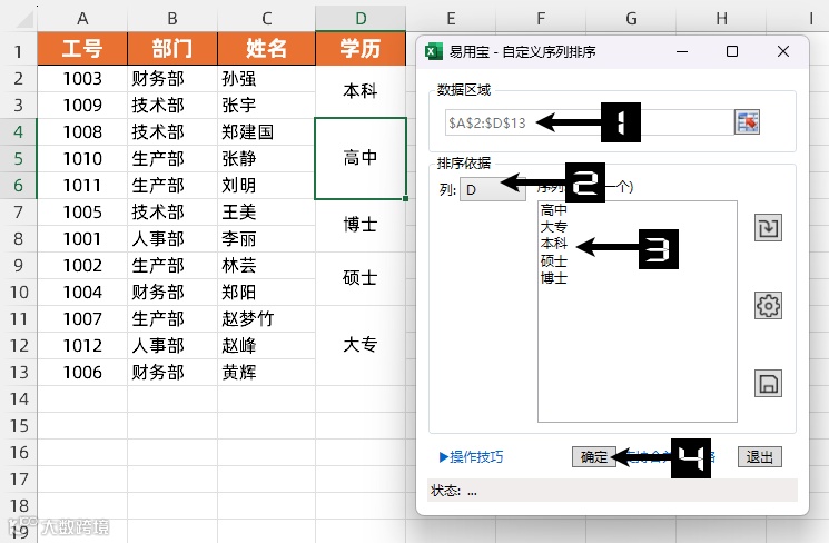 选择排序数据区域(不包含标题),选择排序依据列,输入或导入自定义排序序列,单击【确定】。