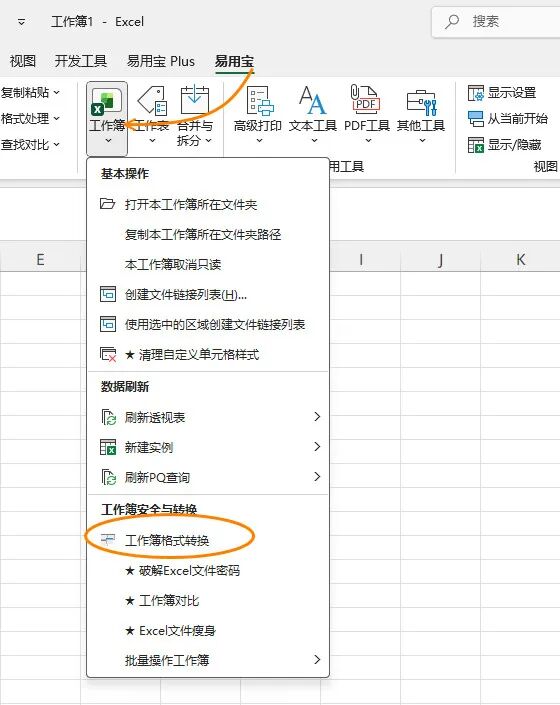 点击【易用宝】→【工作簿】→【工作簿格式转换】。
