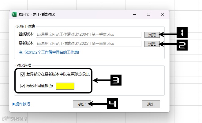 选择基线版本工作簿,再选择最新版本工作簿,勾选对比选项,单击【确定】。
