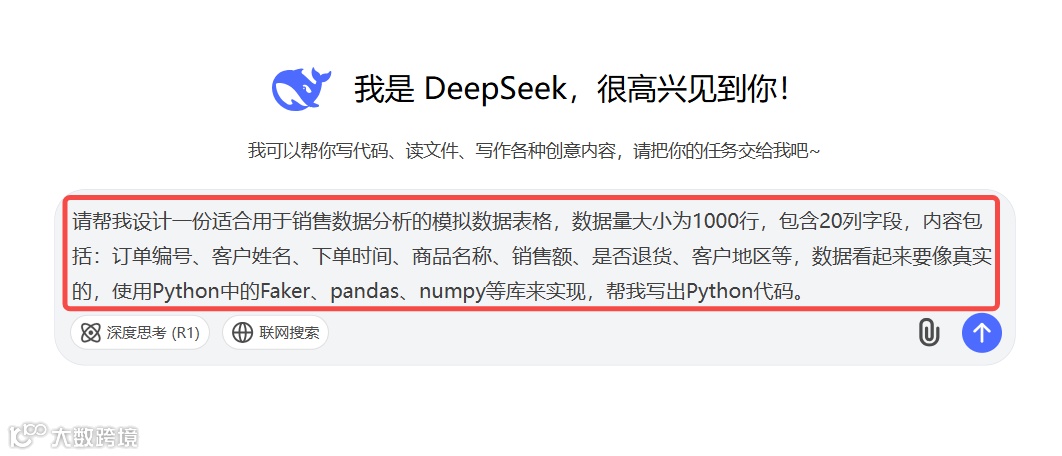 打开DeepSeek首页,输入下面的提示词,借助DeepSeek快速生成字段清单,同时要求输出完整的可执行的Python代码。